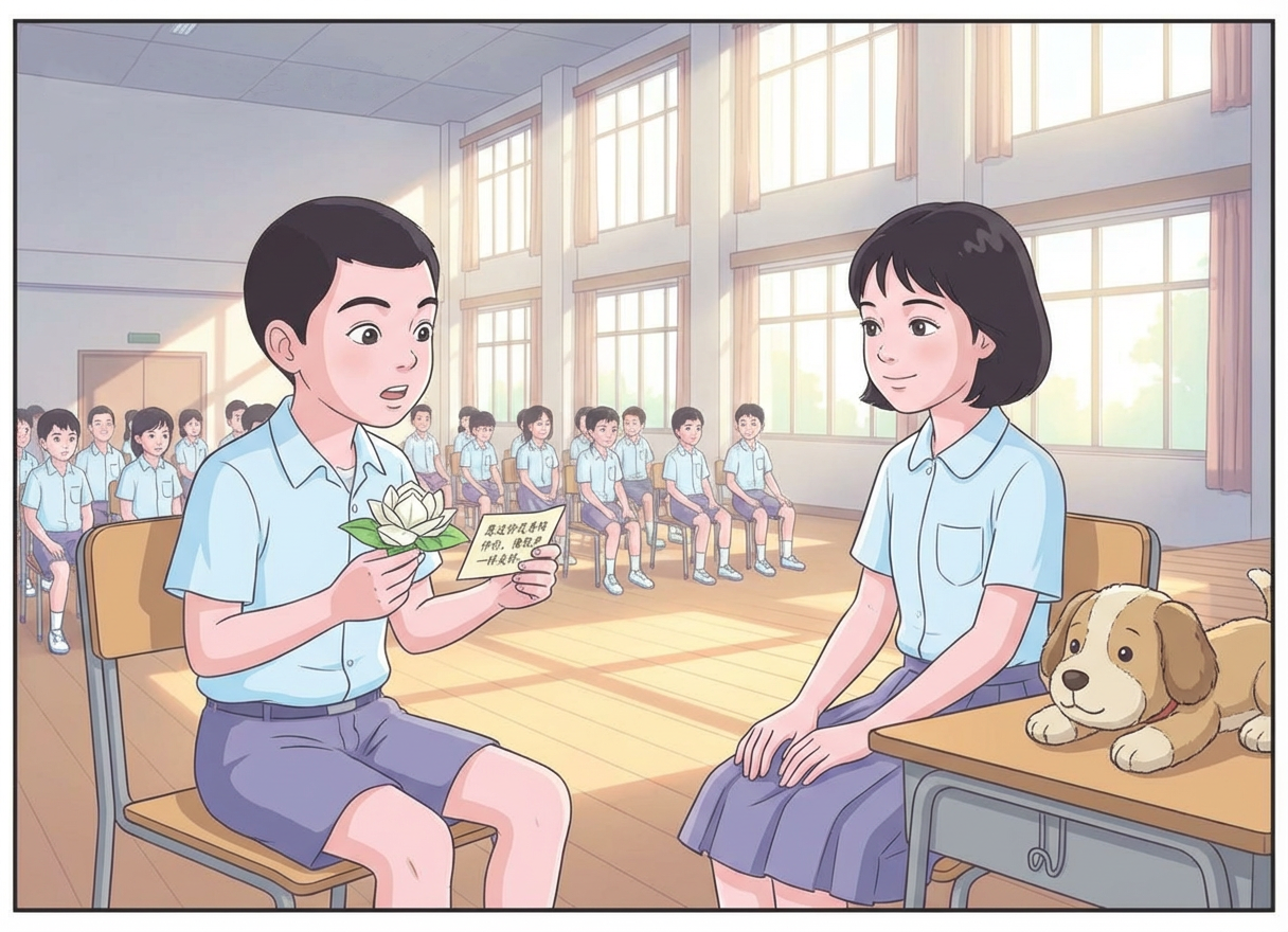 回到座位上拆开后,他惊讶地看到,包裹里是一只折得精致的纸茉莉花,花瓣间还夹著一张小纸条,上面写著:愿这份花香陪伴你,像歌声一样美好。字迹秀气,带著熟悉的温暖。波菜抬头望向礼堂四周,那位小女生正坐在不远处,向他轻轻一笑。