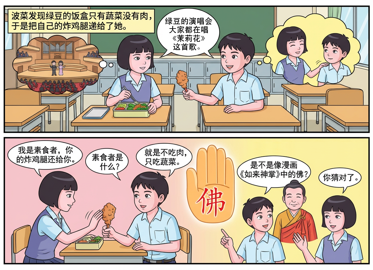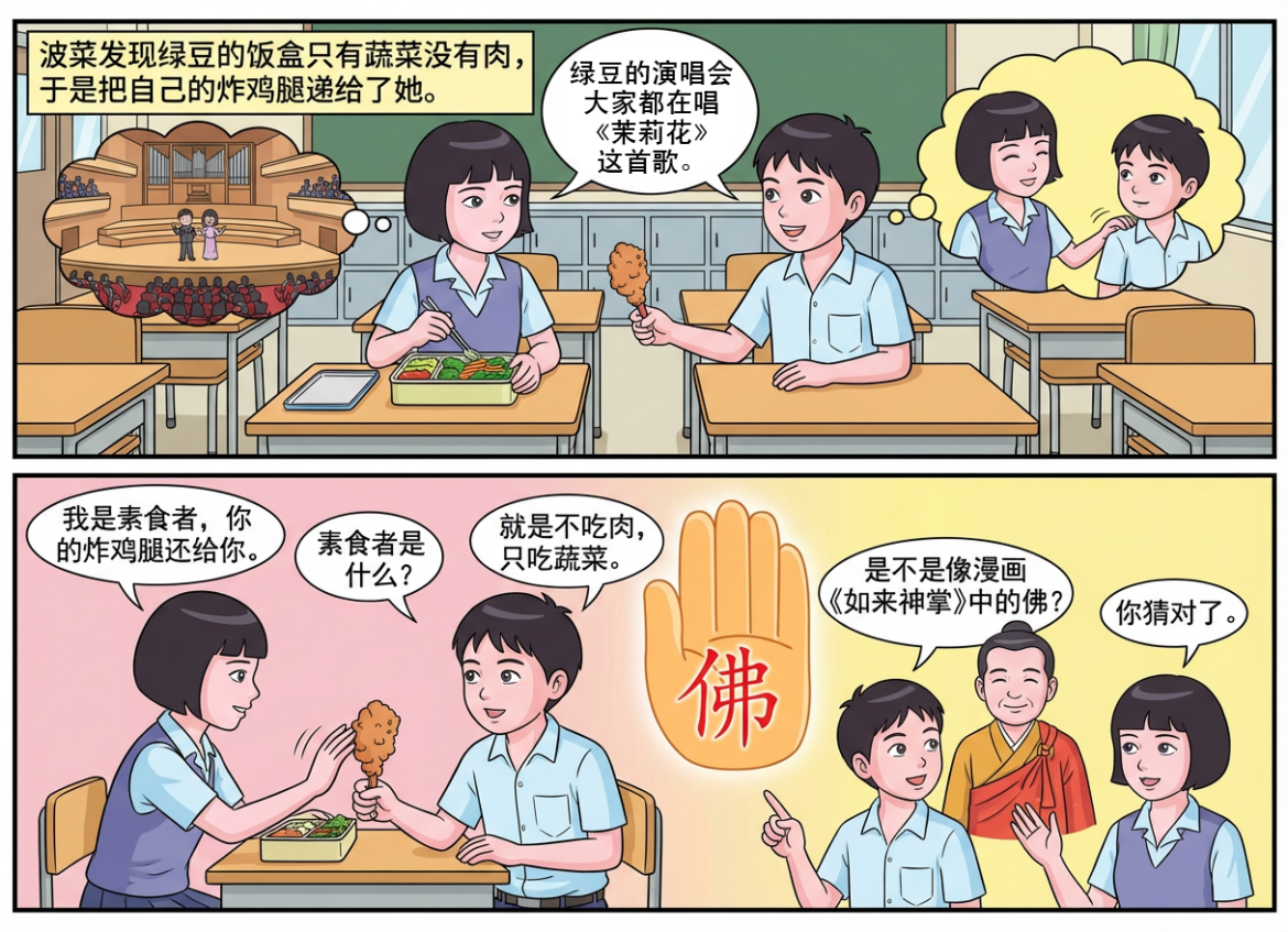 波菜好奇地问:素食者是什么?绿豆解释道:就是不吃肉,只吃蔬菜。波菜思考著:为什么不吃肉,只吃蔬菜?他决定问绿豆,她回答道:因为我父母是菩萨,他们信奉佛教,所以不吃肉。 波菜追问:是不是像漫画《如来神掌》中的佛?绿豆笑著点头:你猜对了。