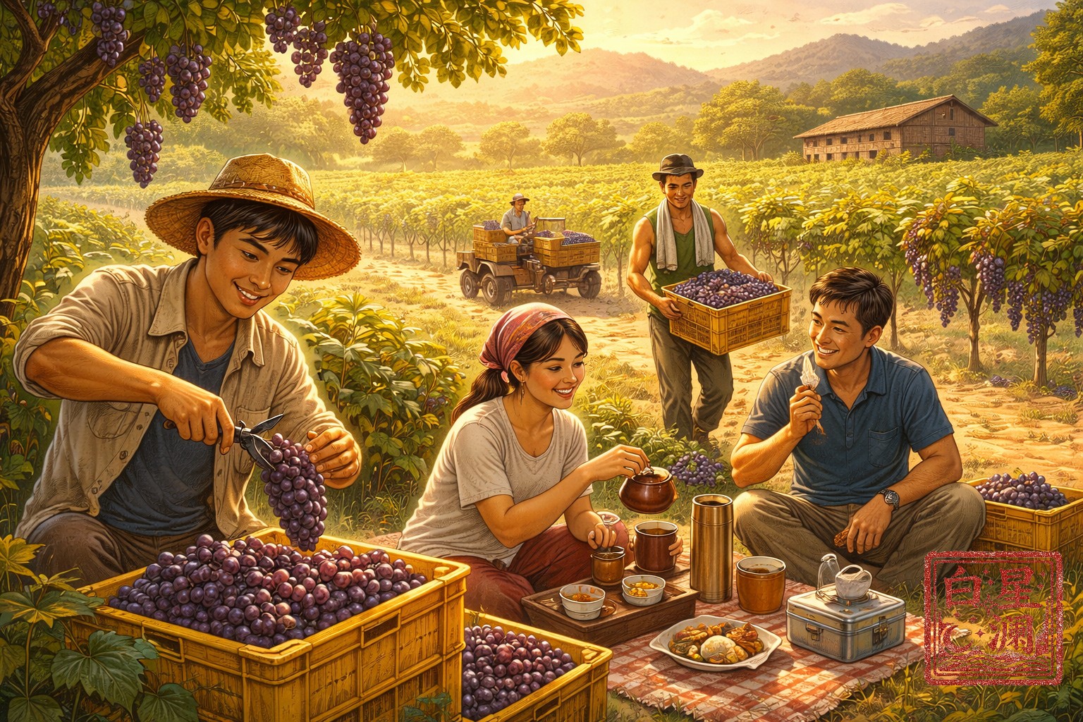 第一串被正式剪下的葡萄,在晨光中沉甸甸地坠入我手中的塑料筐。果霜莹莹,折射着微光。我忽然想起昨夜临睡前,大家难得的集体沉默。后来阿明轻声说,他想起祖母在橡胶林割胶的样子,也是这般黎明前的黑暗中开始,胶汁如奶白的泪。雅婷说,她母亲在茶园采一心二叶,指尖染着终年不褪的绿。大伟说起父亲在麦田弯腰挥镰,脊背弯成一座山的剪影。阿杰则回忆童年跟父亲上茶楼,看见老师傅用精巧的钳子料理虾饺。所有的劳作,所有的离乡背井,所有的技艺与传承,最终似乎都凝结于这最原始的动作——用双手向土地索取甜蜜,在异乡复刻父辈的姿势。剪刀是我父亲的割胶刀,是雅婷母亲的采茶指,是大伟父亲的镰刀,是阿杰眼中茶楼师傅的银钳。我们切割的,不仅是果梗,也是我们与各自源头之间,那看不见的、坚韧的脐带。
