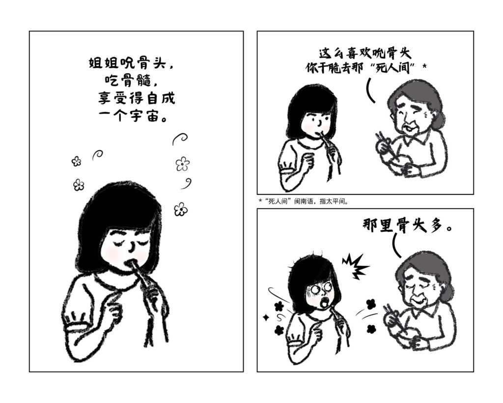 婆婆说:“这么喜欢吮骨头,你干脆去那‘死人间’,那里骨头多。”(注:“死人间”是闽南语,指太平间。)