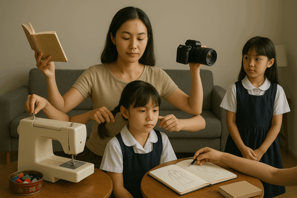 照顧女兒,也是我的工作。籃子裡的髮帶、迷你髮夾、小桶裡的木梳、搓灰圓餅、電動鉛筆刨、掛在椅背的校服,通通為她們所有。上學日時,待她們一切準備就緒後,即坐在椅子上,讓我為她們綁髮夾髮,方可安心去學校。