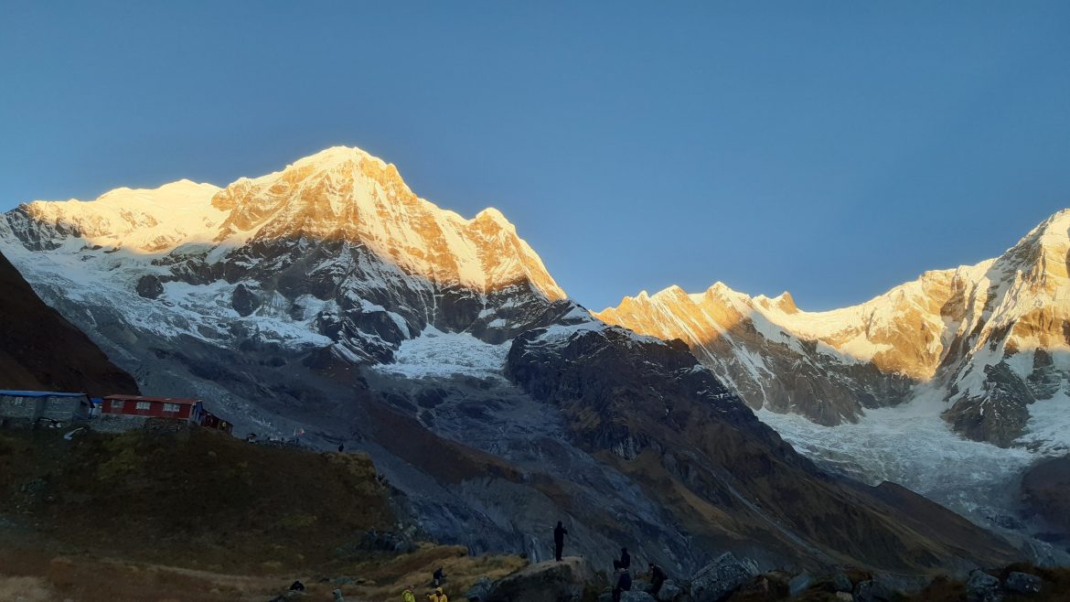 过一阵子,转头一看,几个男女游客,靠在阳台的栏杆旁边,手上的摄影机和手机早已经放下,就只站在那儿眺望远方,静静得观赏安娜普尔纳群峰。顿时我醒悟过来,日照金山的景色转瞬即逝,十分珍贵难得。我只顾着拍照打卡,忙着找镜头摆姿态,就快错过当下眼前这美好的一幕。我立马放下手机,专注得望着雪山,静静地欣赏眼前极致的景色。