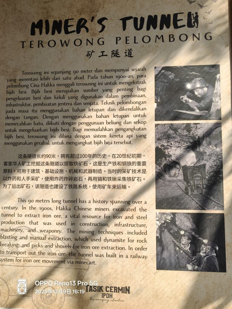 首先和镜湖2一样,要出示ic买票。之后你会经过一条长廊,里面是石头路,有点难走,建议穿包鞋走进去。沿途可以看看以前的人开采锡矿的历史,它就像历史长廊一样,带我们回到百多年前的场景。如今虽然再也看不到这般大工程的开采,但这些历史值得我们铭记。锡矿不仅促进当时的经济发展,更是华人在马来西亚这片土地扎根的证据。