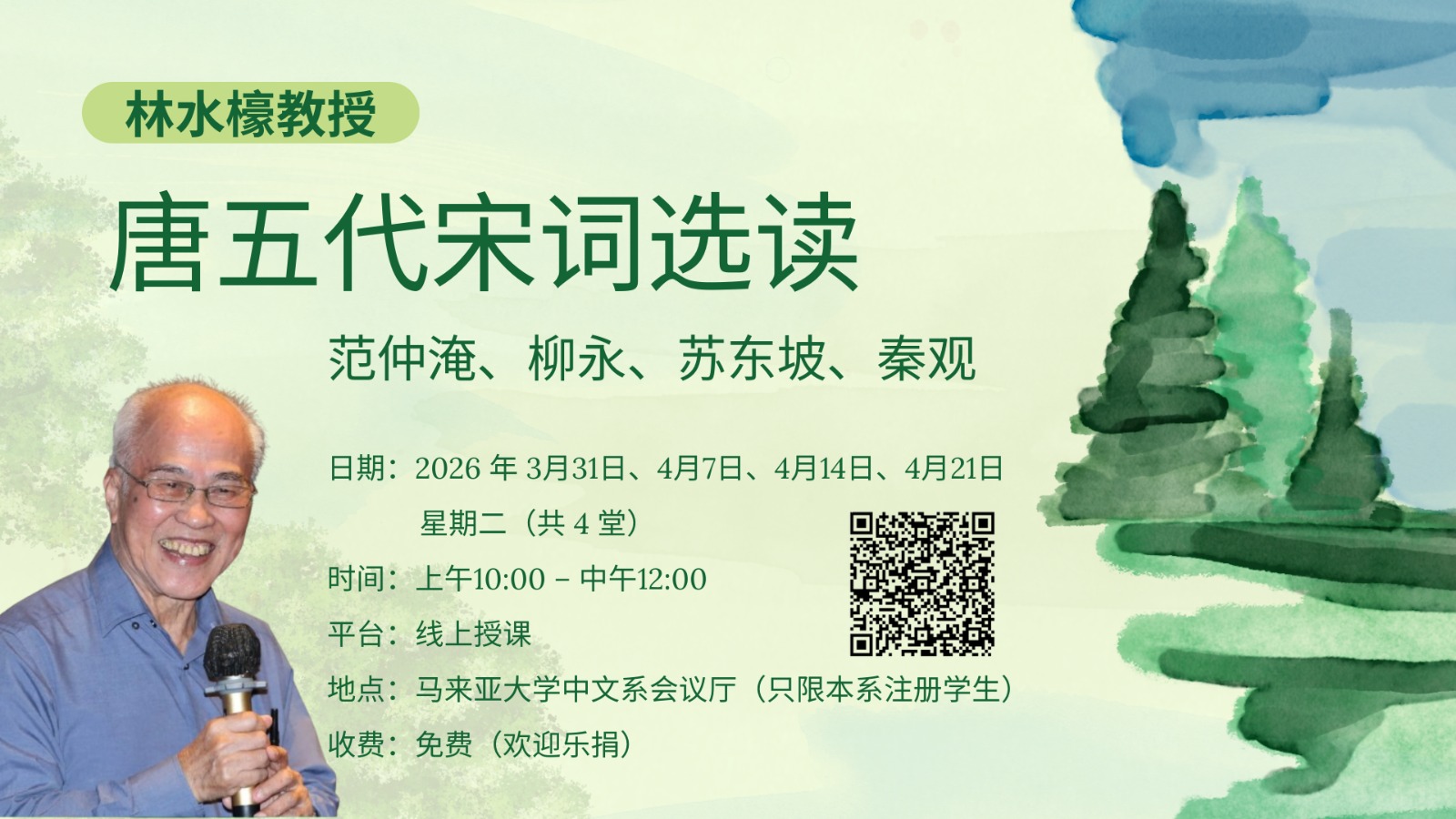 马来亚大学中文系特邀请马来西亚著名诗词学者林水檺教授给学生主讲“唐五代宋词选读”,将带领大家走进优美的文学世界。本期为期四周的课程特开放网上直播,不收取学费,欢迎有兴趣的公众参与,并以随喜乐捐的方式支持课程的举办。