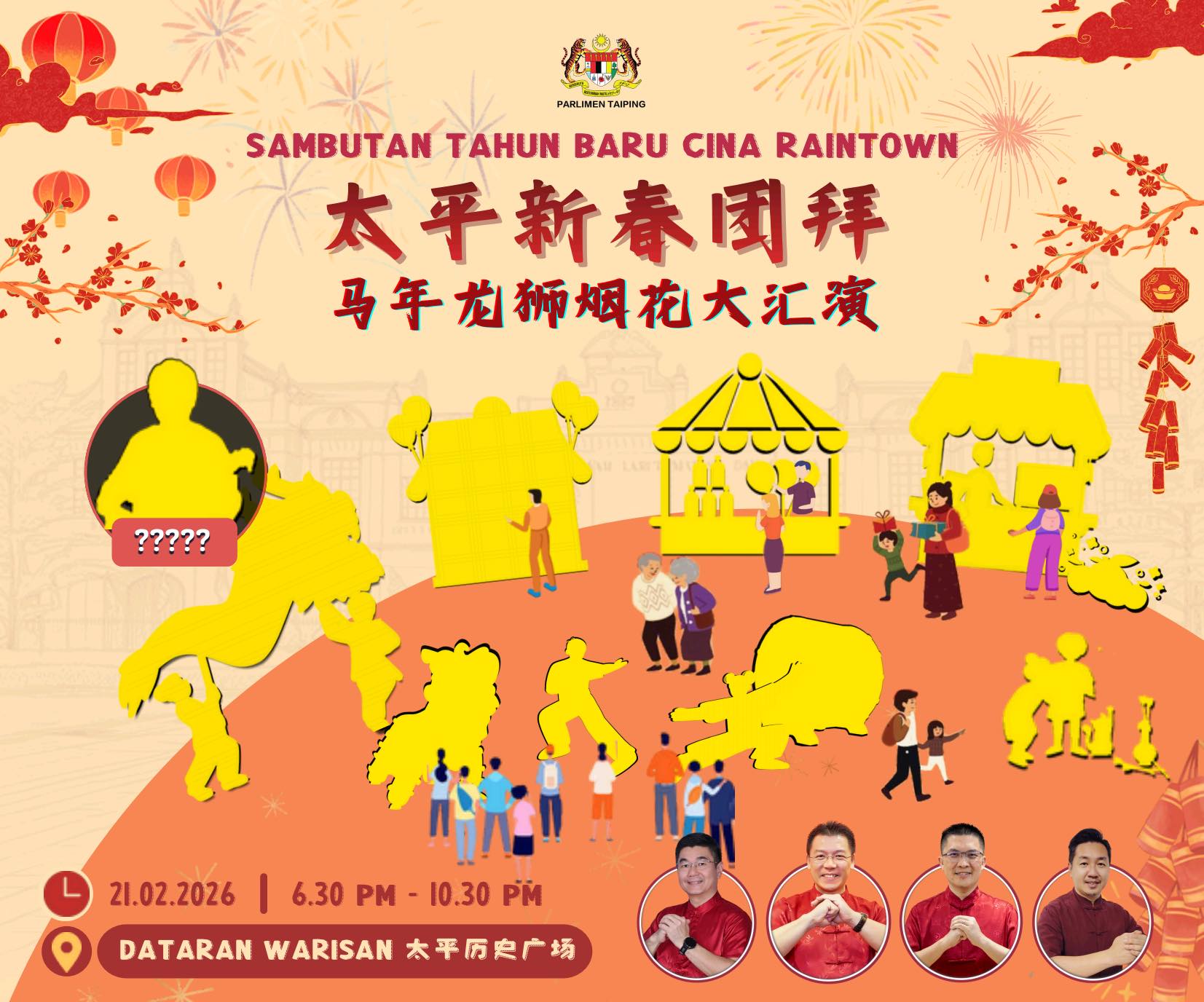 Dataran Warisan 太平历史广场 897, Jalan Taming Sari, Taiping, Perak, Malaysia让我们一起在欢声笑语中,感受新年的喜庆氛围,增进彼此的联系,共同展望更美好的未来!我们诚邀您的参与,与家人朋友一同到来,迎接马年,马上好运!祝您新年快乐,万事如意!