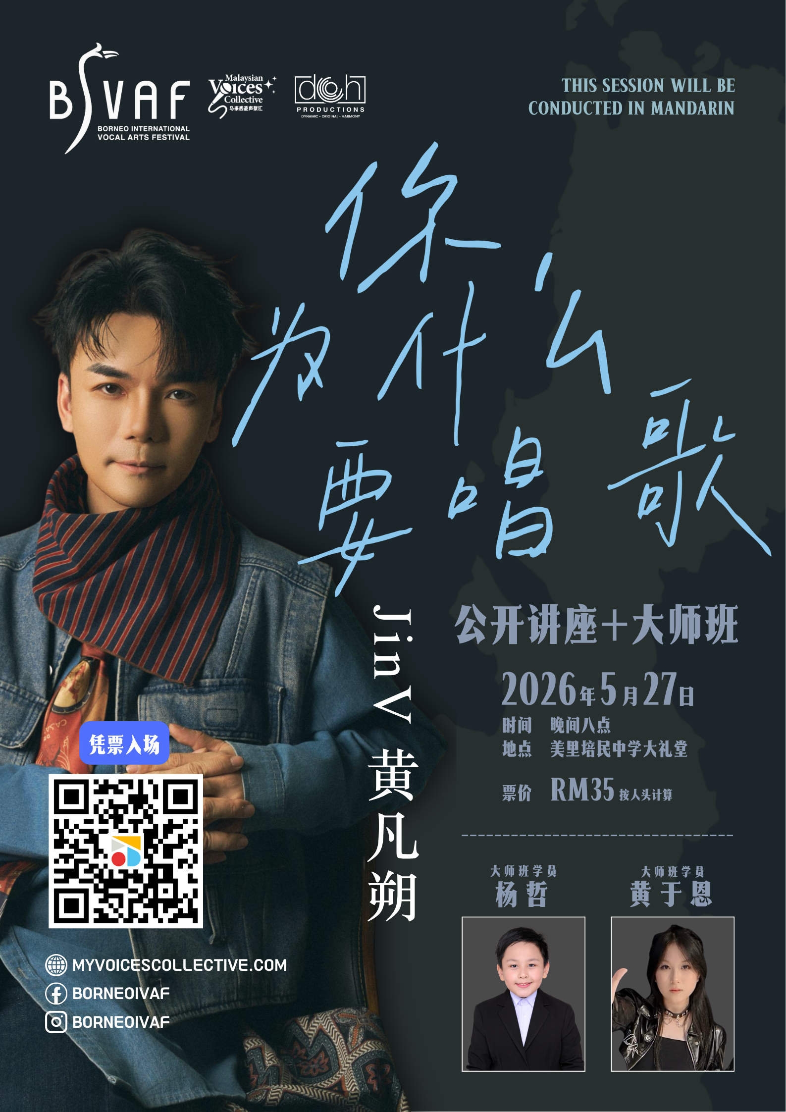 BIVAF2026 Special Event: 黄凡朔《你为什么要唱歌》公开讲座 + 大师班 – Pei Min Middle School Auditorium, Sarawak May 27 BIVAF2026 Special Event: 黄凡朔《你为什么要唱歌》公开讲座 + 大师班 – Pei Min Middle School Auditorium, Sarawak 8:00 pm - 10:00 pm RM35
